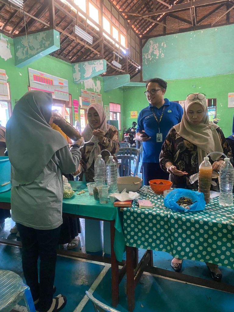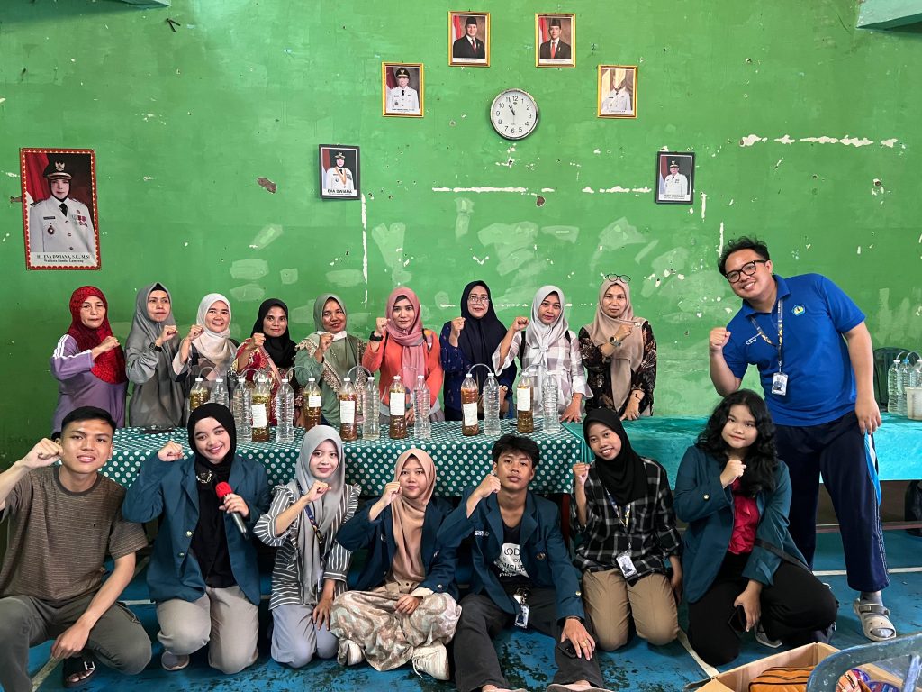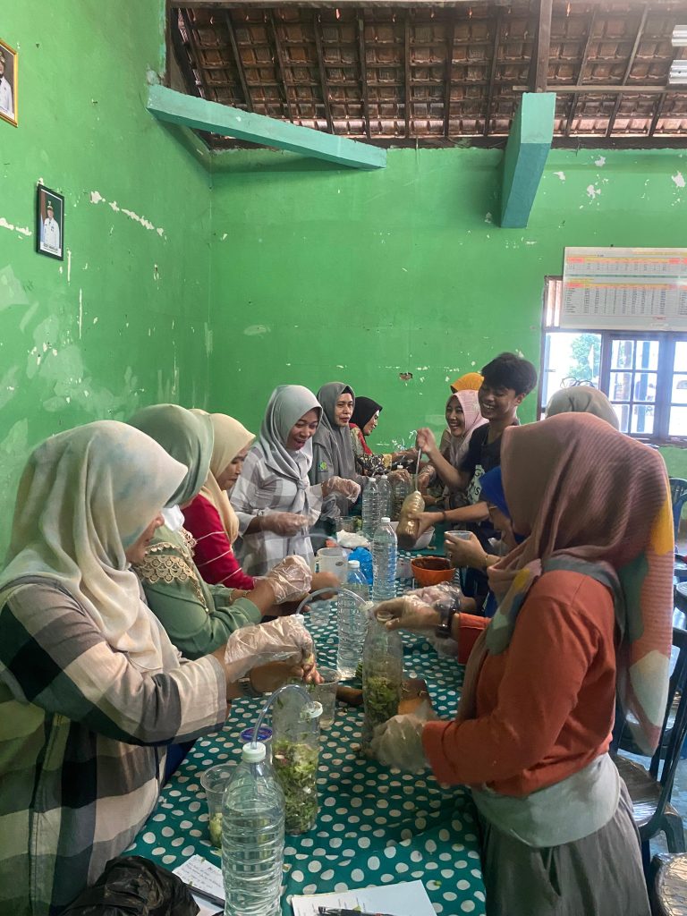 Setelah sesi penjelasan, kegiatan dilanjutkan dengan praktik langsung membuat eco-enzyme. Ibu-ibu PKK dibagi menjadi beberapa kelompok kecil untuk mencampurkan bahan-bahan, melakukan pengukuran komposisi, serta menyusun tahapan fermentasi. Proses ini dipandu oleh mahasiswa agar setiap peserta memahami cara pembuatannya secara tepat.