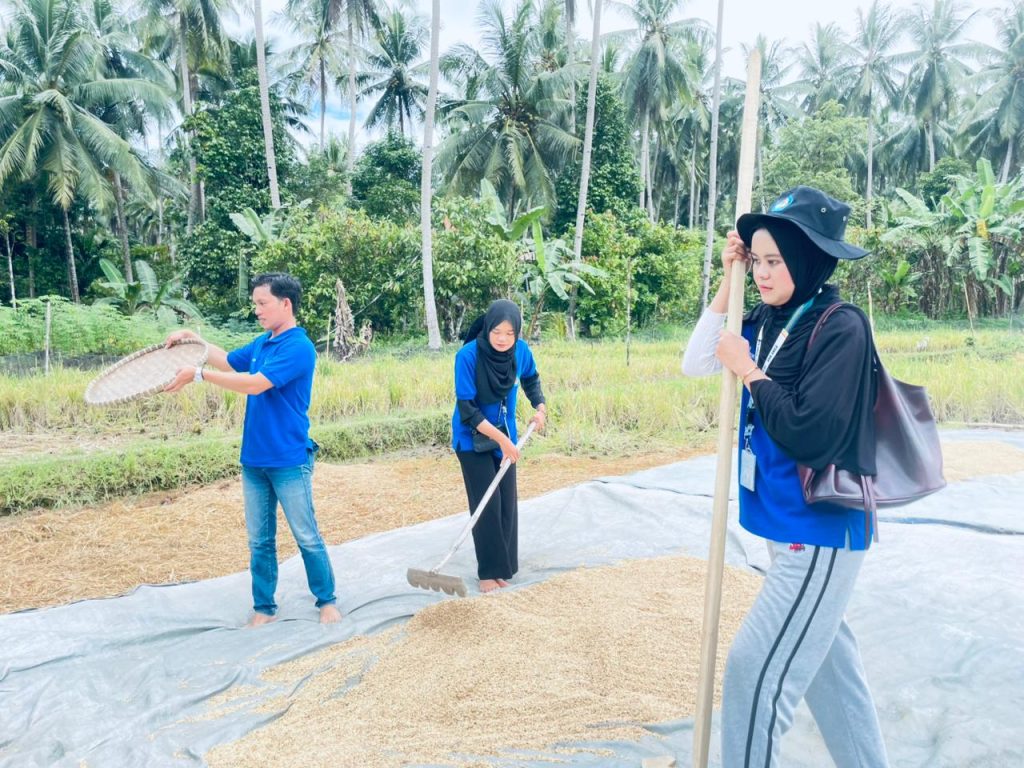 Tahapan berikutnya berupa pengeringan gabah dengan cara dijemur hingga mencapai kadar air yang sesuai. Proses dilakukan secara bertahap untuk memisahkan sekam dan dedak hingga menghasilkan beras. Selain metode tradisional, mahasiswa juga mendapatkan penjelasan mengenai proses penggilingan modern menggunakan mesin, termasuk tahapan pemutihan beras yang biasa dilakukan di pabrik.