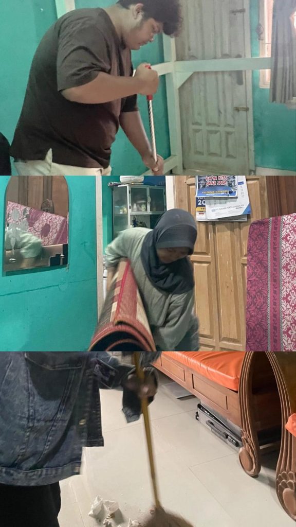 Kegiatan diawali dengan membersihkan posko secara menyeluruh. Mahasiswa bersama-sama menyapu, mengepel, merapikan peralatan, serta menata kembali ruang agar tetap nyaman dan fungsional. Aktivitas ini tidak hanya bertujuan untuk menjaga kebersihan fisik, tetapi juga menciptakan suasana kerja yang lebih kondusif, sehingga setiap anggota tim dapat beraktivitas dengan lebih tertib dan efektif.