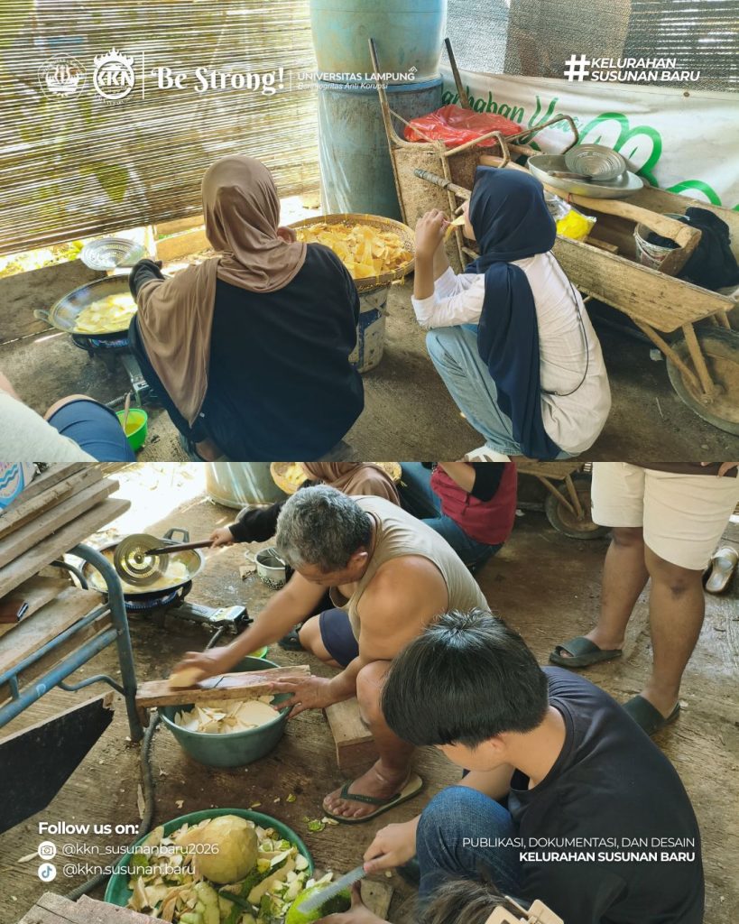 Setelah kegiatan Jumat Bersih, mahasiswa melanjutkan aktivitas di rumah Bapak Suraji dengan membuat keripik sukun Harmony antara mahasiswa dan warga terlihat jelas dalam proses ini. Mahasiswa belajar langsung mulai dari pemilihan bahan, pengupasan, perendaman, hingga proses penggorengan dan pengemasan sederhana. Kegiatan ini memberikan wawasan tentang potensi pangan lokal yang dapat dikembangkan sebagai usaha rumahan.