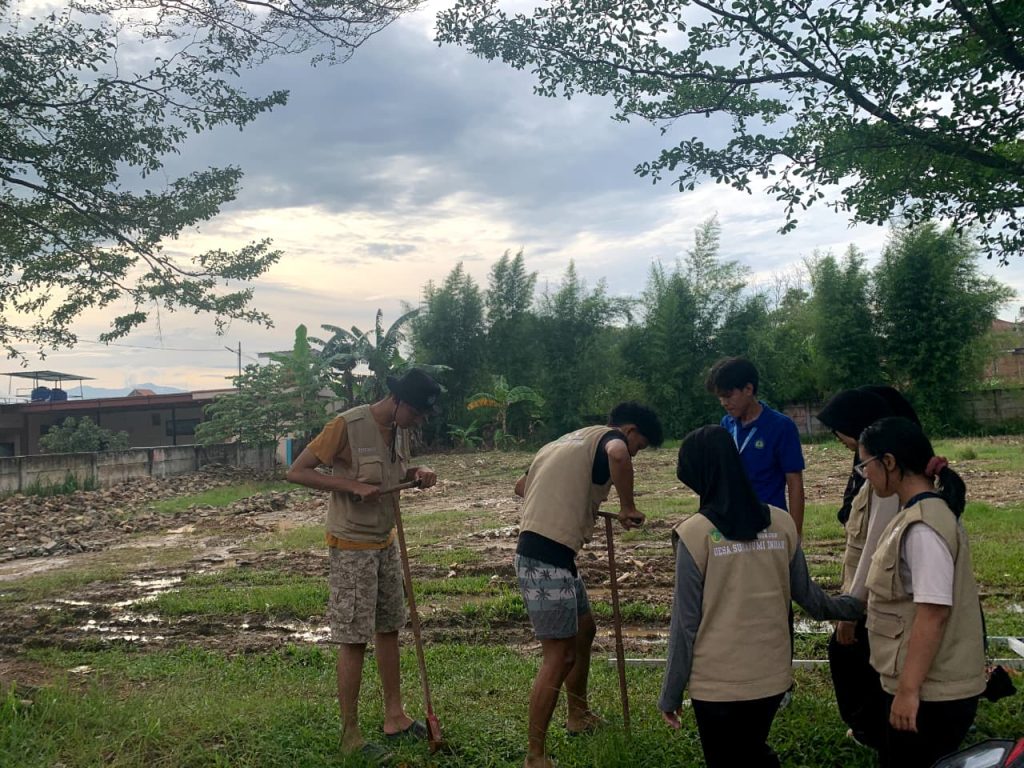 Setelah kegiatan pemberian buku selesai dilaksanakan, mahasiswa KKN melanjutkan rangkaian kegiatan pada sore hari dengan melakukan pemasangan plang sampah di samping Masjid As Salam. Lokasi pemasangan plang dipilih karena berada di area lapangan terbuka yang cukup ramai dan sering dilalui oleh kendaraan, baik mobil maupun sepeda motor, sehingga dinilai strategis dan mudah terlihat oleh masyarakat yang melintas di sepanjang jalan tersebut. Area tersebut juga merupakan salah satu titik yang sering menjadi tempat berkumpulnya masyarakat, sehingga pemasangan plang diharapkan dapat memberikan dampak yang lebih luas.