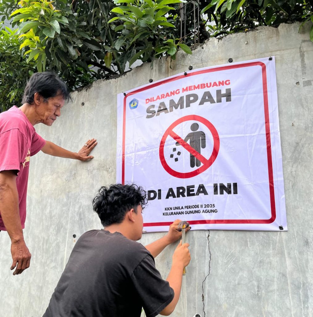 Kelurahan Gunung Agung, 15 Agustus 2025 — Dalam rangka melaksanakan program kerja “Go Green, Go Clean, Go Gunung Agung“, mahasiswa KKN Unila melakukan pemasangan banner larangan membuang sampah sembarangan di Kelurahan Gunung Agung. Pemasangan dilakukan di titik yang sudah ditentukan, yaitu di Gang Delima, Lingkungan 2 Kelurahan Gunung Agung, yang selama ini menjadi salah satu lokasi rawan terjadinya penumpukan sampah.