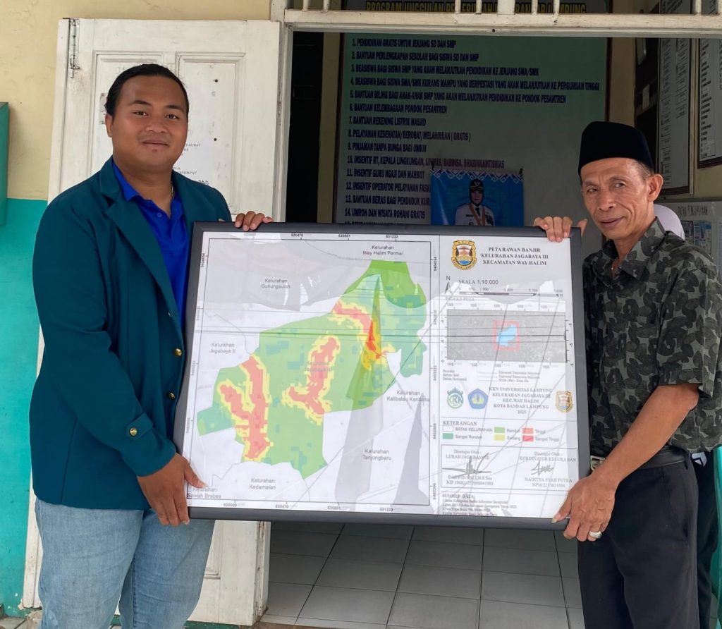 Mahasiswa Kuliah Kerja Nyata (KKN) Universitas Lampung yang bertugas di Kelurahan Jagabaya III melaksanakan program kerja pembuatan peta rawan banjir sebagai upaya memberikan informasi penting kepada masyarakat. Peta ini memuat titik-titik wilayah yang memiliki potensi tinggi terkena banjir, berdasarkan kondisi geografis dan riwayat kejadian sebelumnya. Kegiatan ini juga menjadi bagian dari dukungan mahasiswa KKN terhadap program Pemetaan Wilayah Rawan Bencana yang dicanangkan pemerintah.