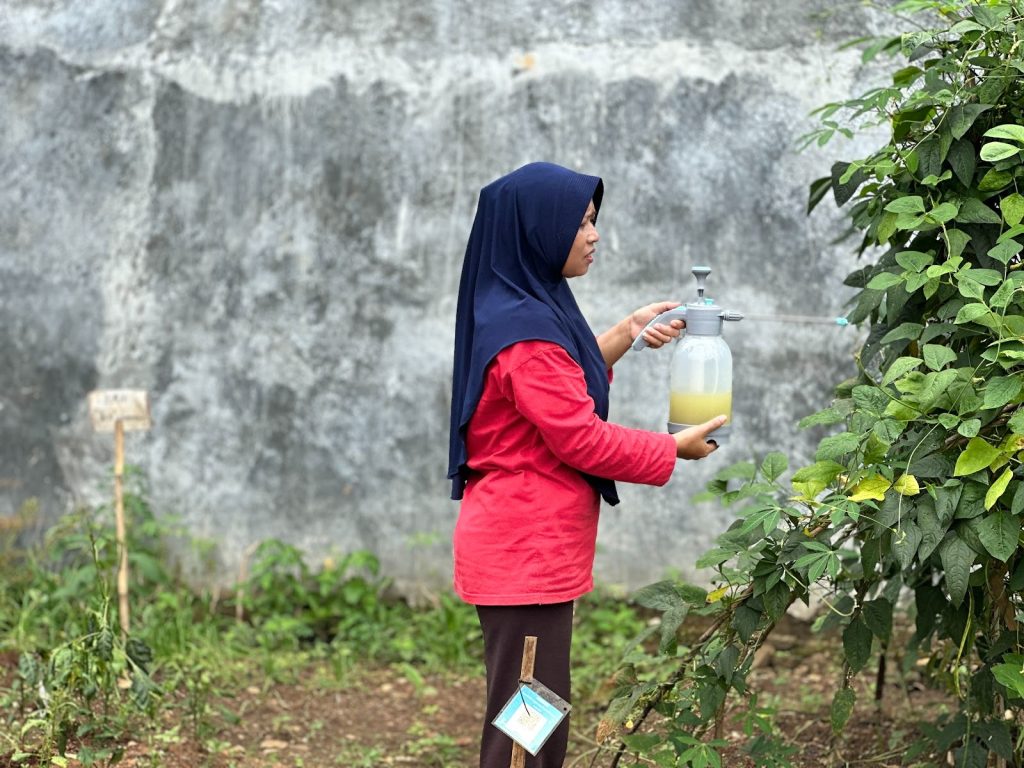 Karena kelompok kami telah menyiapkan sampel biopestisida dan POC sebelumnya, kegiatan dilanjutkan dengan praktik langsung penggunaan biopestisida dan pupuk organik cair pada area tanaman obat keluarga (TOGA) di sekitar lokasi bersama ibu-ibu. Kegiatan ini berlangsung dengan antusias dan partisipasi aktif dari masyarakat.