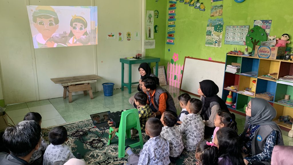 Sebagai bagian dari pembelajaran, anak-anak juga menonton video edukatif tentang bahaya limbah plastik bagi lingkungan. Tayangan tersebut diharapkan dapat menumbuhkan kesadaran mereka terhadap pentingnya mengelola sampah dengan bijak.