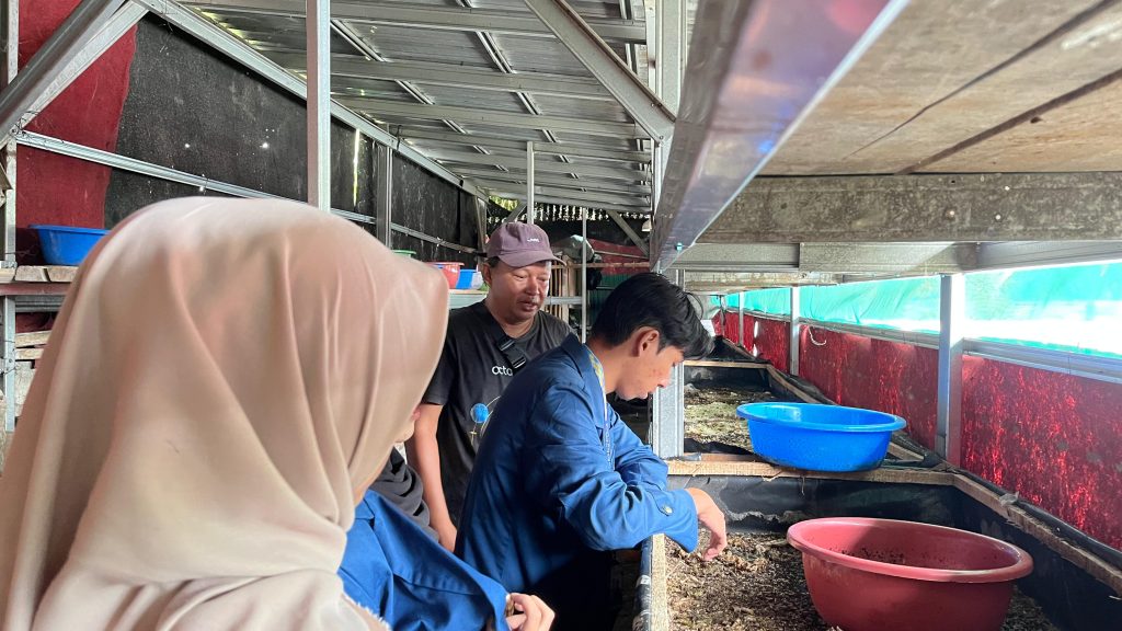 Dalam kegiatan ini, mahasiswa didampingi oleh Pak Panto, salah satu tokoh warga Desa Karang Anyar yang dikenal aktif dalam kegiatan pemberdayaan masyarakat. Pak Panto memandu para mahasiswa mengelilingi area budidaya dan menjelaskan secara detail mengenai siklus hidup Maggot.