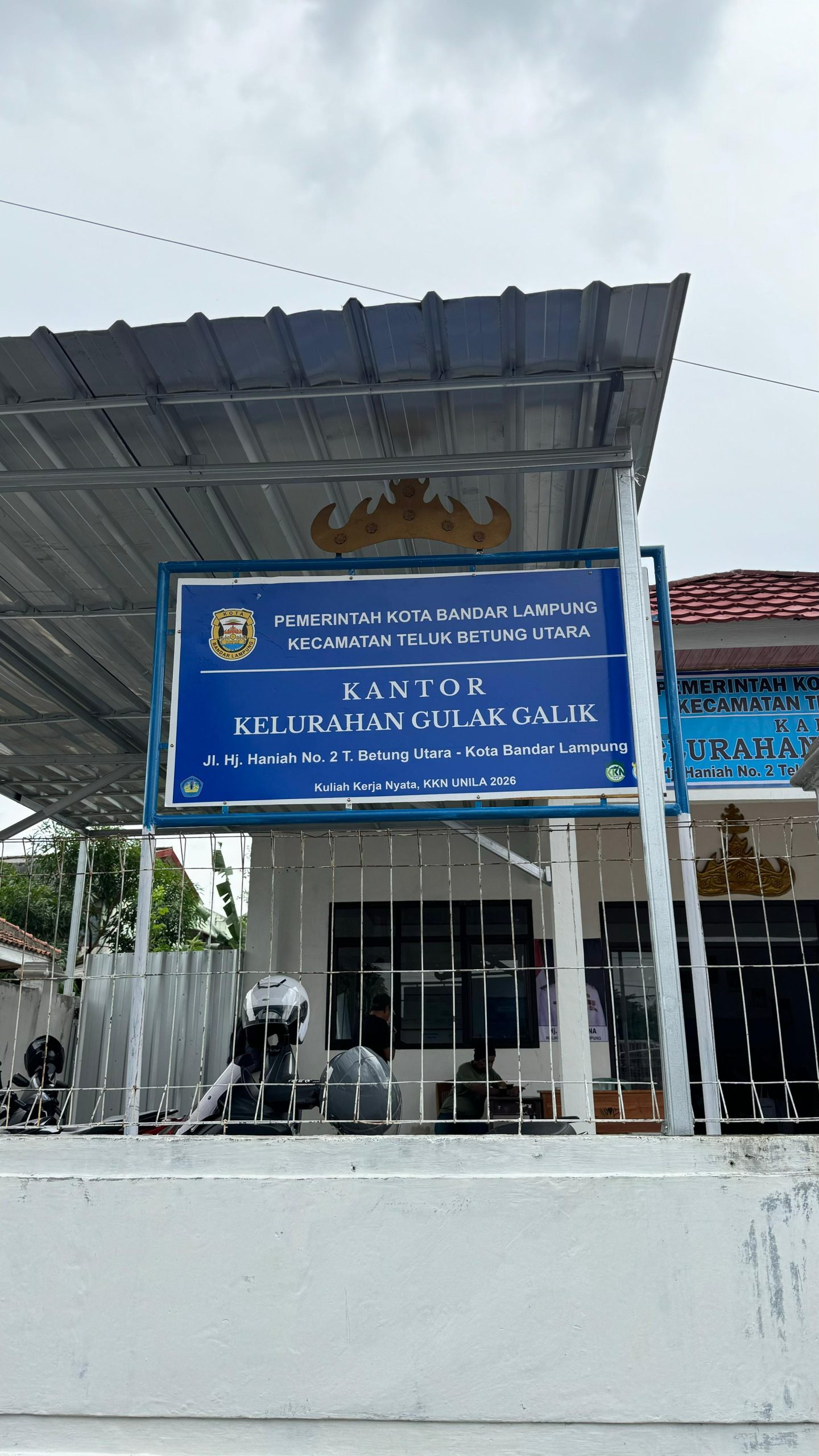 Pada hari ini, Senin, 19 Januari 2026 mahasiswa Kuliah Kerja Nyata (KKN) Universitas Lampung Periode I Tahun 2026 Kelompok 2 Kelurahan Gulak Galik melaksanakan serangkaian kegiatan pengabdian kepada masyarakat yang berfokus pada bidang kesehatan dan koordinasi program kerja. Kegiatan ini bertujuan untuk mendukung program kelurahan serta mempererat hubungan antara mahasiswa KKN dengan masyarakat setempat.