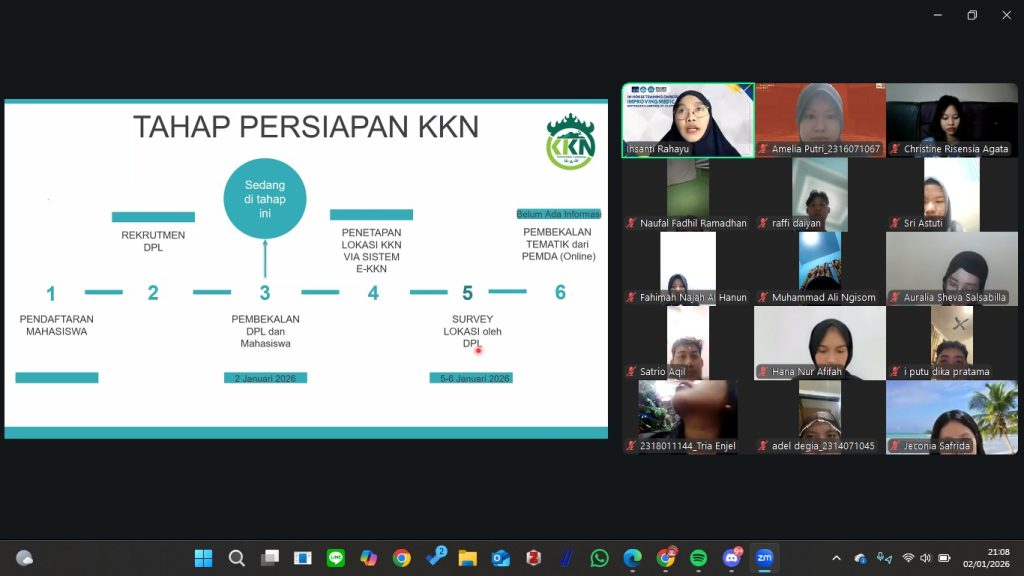 Kegiatan pembekalan Kelompok Kuliah Kerja Nyata (KKN) Bumi Waras 2 dilaksanakan secara online/daring pada Jumat, 2 Januari 2026 dengan pendampingan langsung oleh Dosen Pembimbing Lapangan (DPL) Apt. Ihsanti Dwi Rahayu, M.S.Farm. Pembekalan ini merupakan agenda awal yang bertujuan untuk memberikan arahan dan penjelasan kepada mahasiswa terkait pelaksanaan KKN di Kelurahan Bumi Waras.