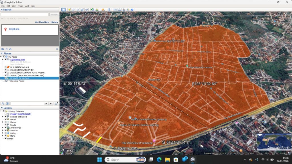 Berdasarkan hasil pemetaan sementara, ditemukan beberapa titik di wilayah Lingkungan 1 Rajabasa Raya yang memiliki potensi genangan cukup tinggi, selokan yang tertutup tanaman liar, hal ini dipengaruhi oleh kondisi drainase yang kurang optimal serta tingkat kepadatan permukiman yang memengaruhi daerah resapan air. Peta RADAR ini disusun sebagai bentuk kontribusi akademis mahasiswa dalam menyediakan data spasial yang akurat bagi masyarakat dan perangkat kelurahan.