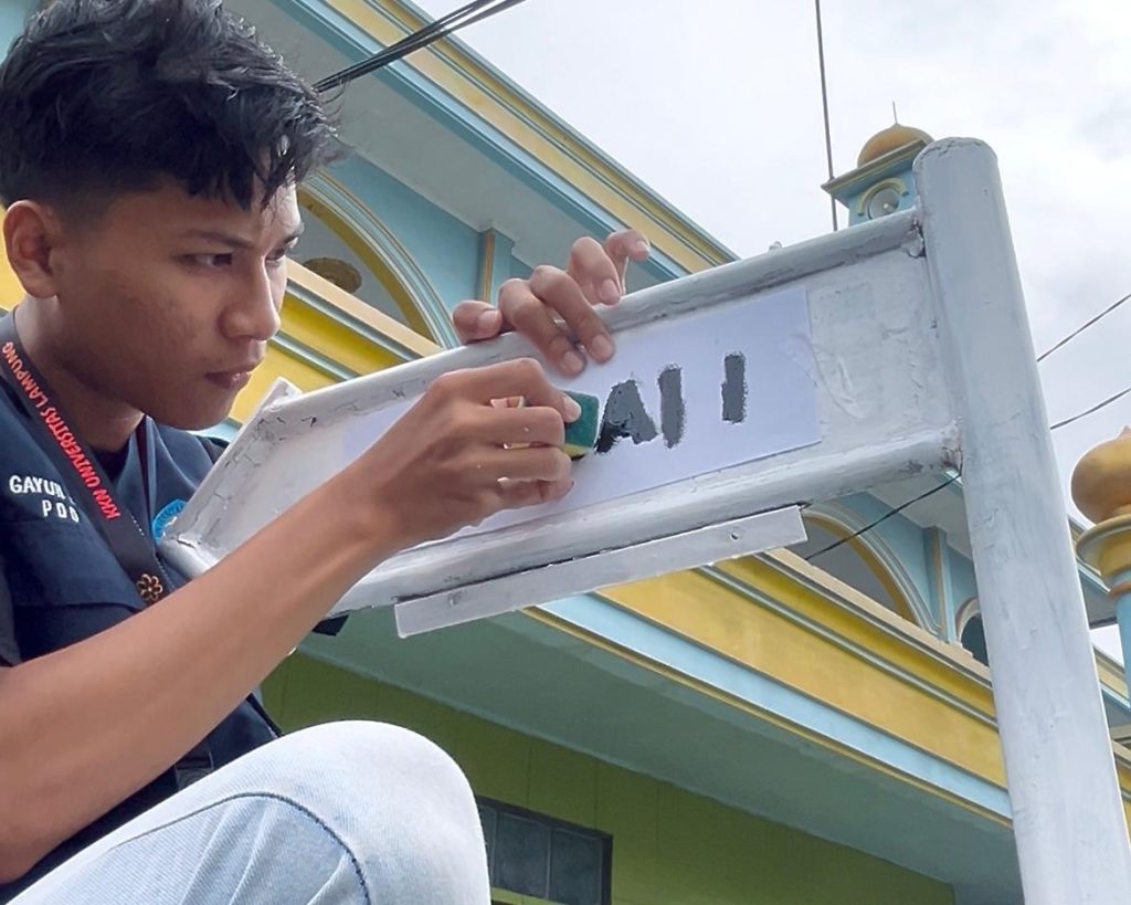 Selain penulisan nama gang, mahasiswa KKN juga memberikan identitas pada tiang plang jalan sebagai penanda hasil kegiatan pengabdian. Identitas yang dicantumkan berupa tulisan “KKN UNILA 2026” sebagai bentuk dokumentasi dan pertanggungjawaban program kerja yang telah dilaksanakan.