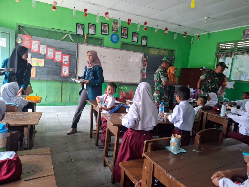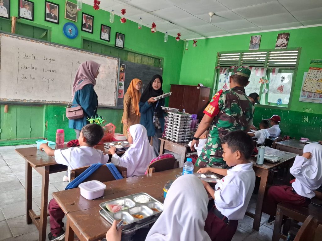 Mahasiswa KKN Unila membantu proses pendistribusian makanan kepada para siswa, sekaligus memberikan edukasi singkat mengenai pentingnya asupan gizi untuk tumbuh kembang dan konsentrasi belajar.