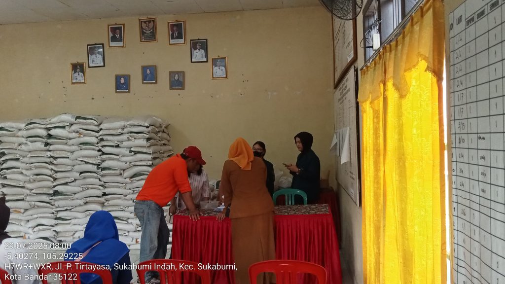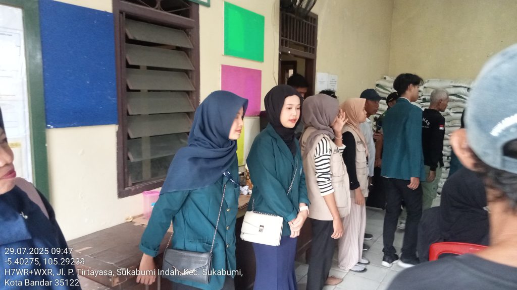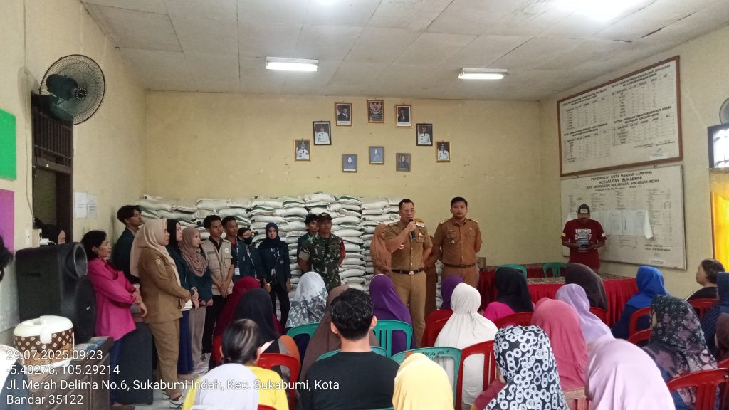 Secara paralel, Tim KKN memfasilitasi penyaluran bantuan beras dari Pemerintah Kota Bandar Lampung kepada keluarga prasejahtera di lingkungan kelurahan. Distribusi yang berlangsung tertib di Balai Kelurahan ini merupakan bentuk sinergi antara program pemerintah dan inisiatif KKN Unila dalam menguatkan ketahanan pangan masyarakat. Bantuan diserahkan secara simbolis oleh Bapak Lurah Muhammad Ridwan didampingi Koordinator KKN, dengan tetap menerapkan mekanisme seleksi penerima berdasarkan data terverifikasi dari RT/RW setempat.