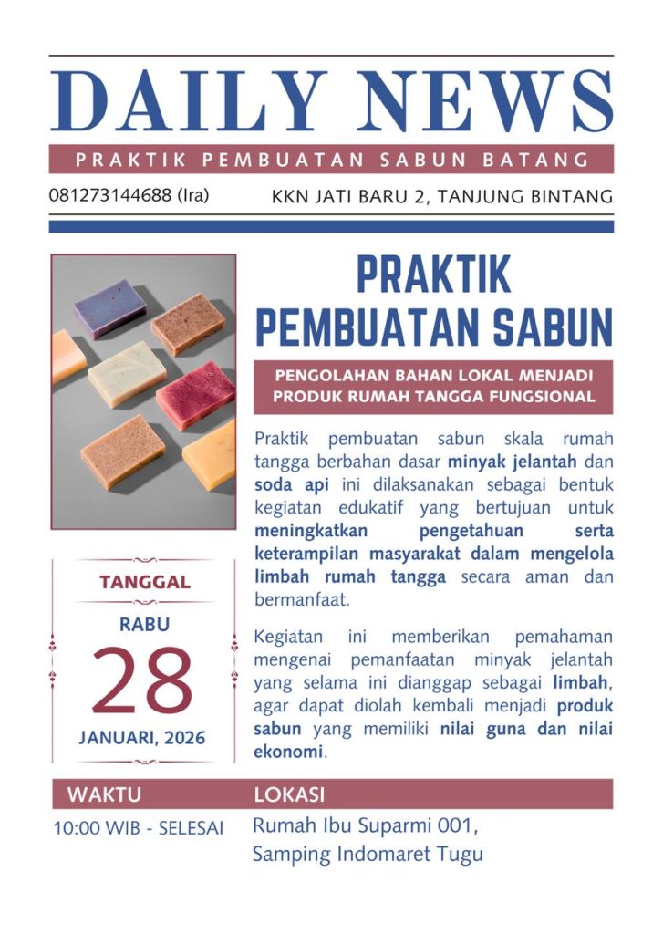 Pada hari ini telah dilaksanakan kegiatan pembagian undangan atau pamflet kepada warga sebagai bagian dari persiapan pelaksanaan program kerja yang akan dilaksanakan di lingPada hari ini telah dilaksanakan kegiatan pembagian undangan atau pamflet kepada warga sebagai bagian dari persiapan pelaksanaan program kerja yang akan dilaksanakan di lingkungan desa. Pamflet yang dibagikan berisi informasi mengenai kegiatan praktik pembuatan sabun batang yang ditujukan khusus bagi ibu-ibu rumah tangga. Kegiatan ini bertujuan untuk menyampaikan informasi secara langsung kepada masyarakat mengenai waktu, tempat, serta rangkaian kegiatan, sehingga warga dapat mengetahui dan berpartisipasi aktif dalam kegiatan tersebut.