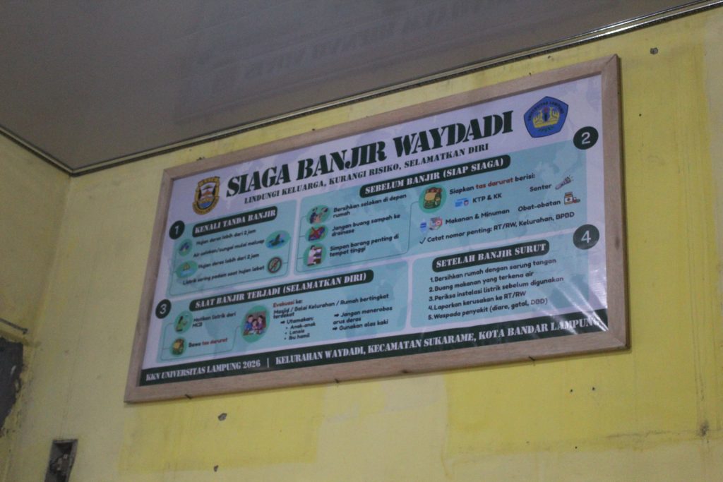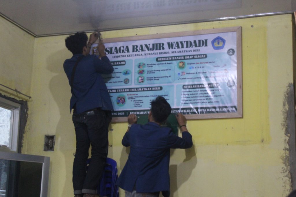 Bandar Lampung, 5 Februari 2026 — Kelompok Kuliah Kerja Nyata (KKN) Way Dadi Lingkungan I melaksanakan kegiatan pemasangan plang mitigasi bencana pada Kamis (5/2). Kegiatan ini berlangsung di Kantor Kelurahan Way Dadi sebagai bagian dari pelaksanaan program kerja Mitigasi Bencana.