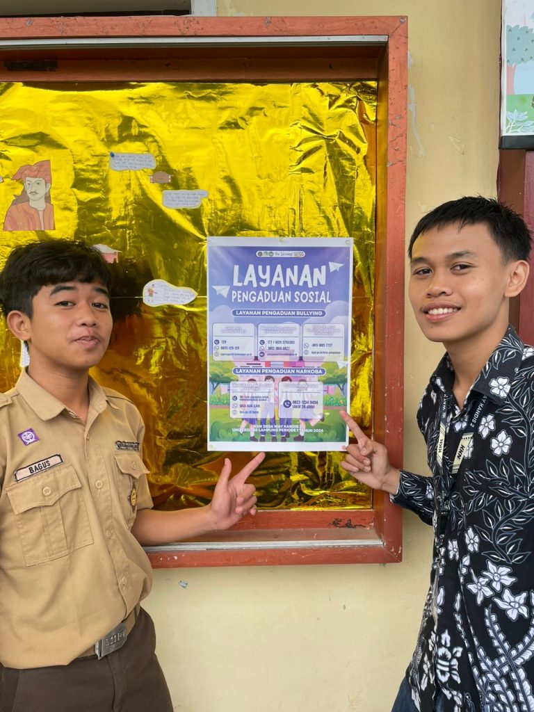 Sebagai bentuk apresiasi dan kerja sama, kelompok KKN Way Kandis 2 menyerahkan plakat kepada pihak sekolah sebagai ucapan terima kasih atas dukungan yang diberikan. Selain itu, mahasiswa juga melakukan penempelan poster edukatif tentang bullying di titik strategis di lingkungan sekolah agar pesan kampanye dapat terus tersampaikan.
