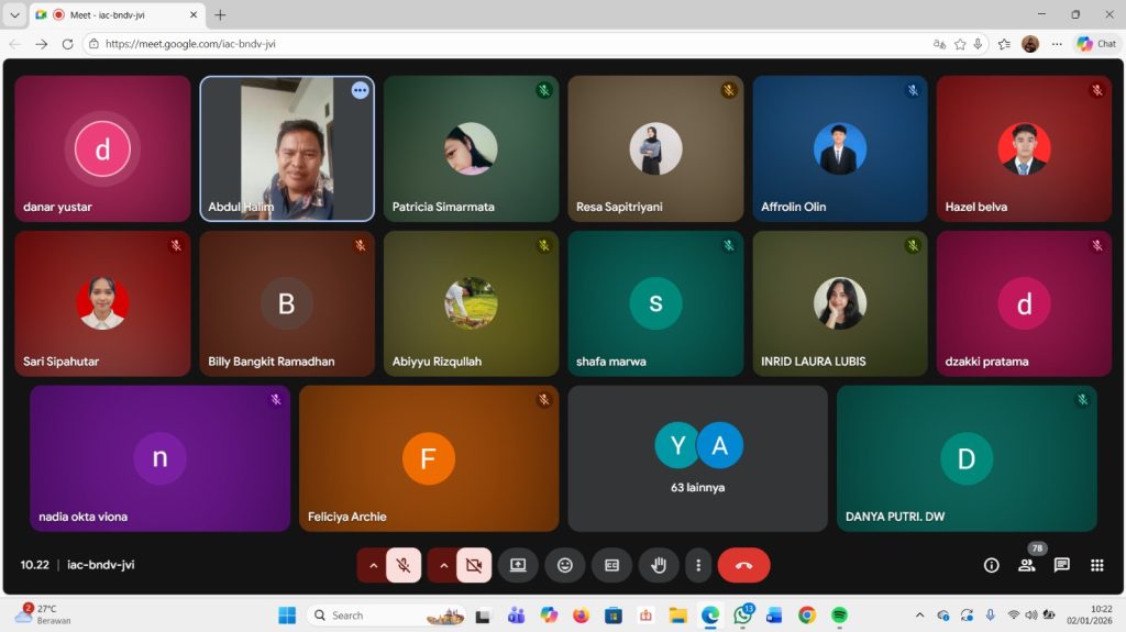 Hari pertama pelaksanaan Kuliah Kerja Nyata (KKN) Kelompok Campang Raya diawali dengan kegiatan koordinasi awal yang dilaksanakan pada tanggal 02 Januari 2026 secara daring melalui platform Zoom Meeting bersama Dewan Pembina Lapangan, Bapak Abdul Halim, S.Pd., M.Pd. Kegiatan ini menjadi langkah awal yang penting bagi mahasiswa KKN untuk mendapatkan arahan, bimbingan, serta gambaran umum mengenai pelaksanaan KKN yang akan dijalankan selama masa pengabdian di lokasi.