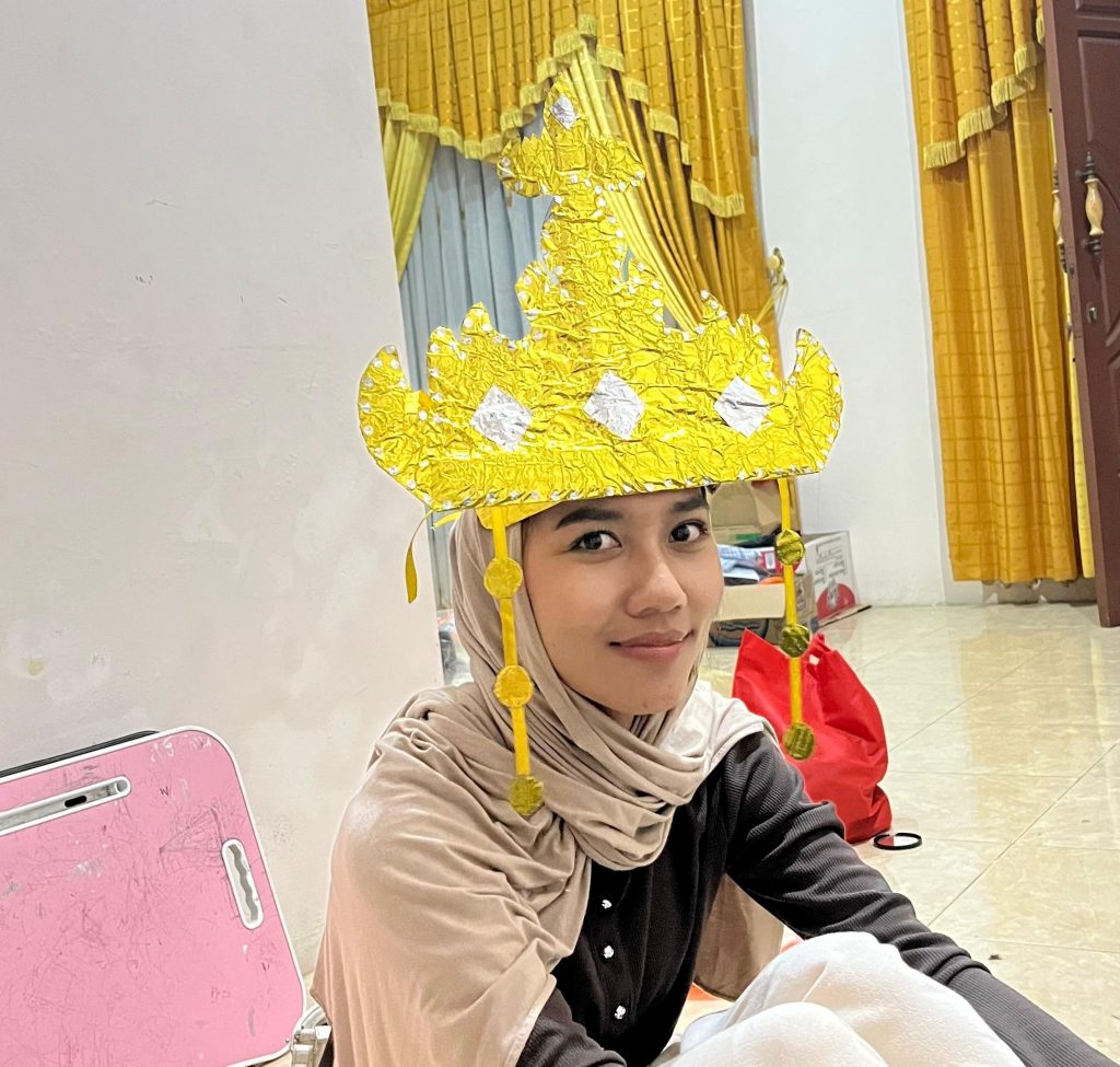 Salah satu persiapan yang dilakukan adalah membuat Siger, mahkota khas Lampung, dengan bahan sederhana namun penuh kreativitas. Mahasiswa KKN bersama warga memanfaatkan kardus bekas dan karton tebal sebagai rangka dasar Siger. Bahan-bahan ini dipotong dan dibentuk menyerupai lekuk khas Siger Lampung yang identik dengan tujuh atau sembilan lengkungan megah di bagian atas.