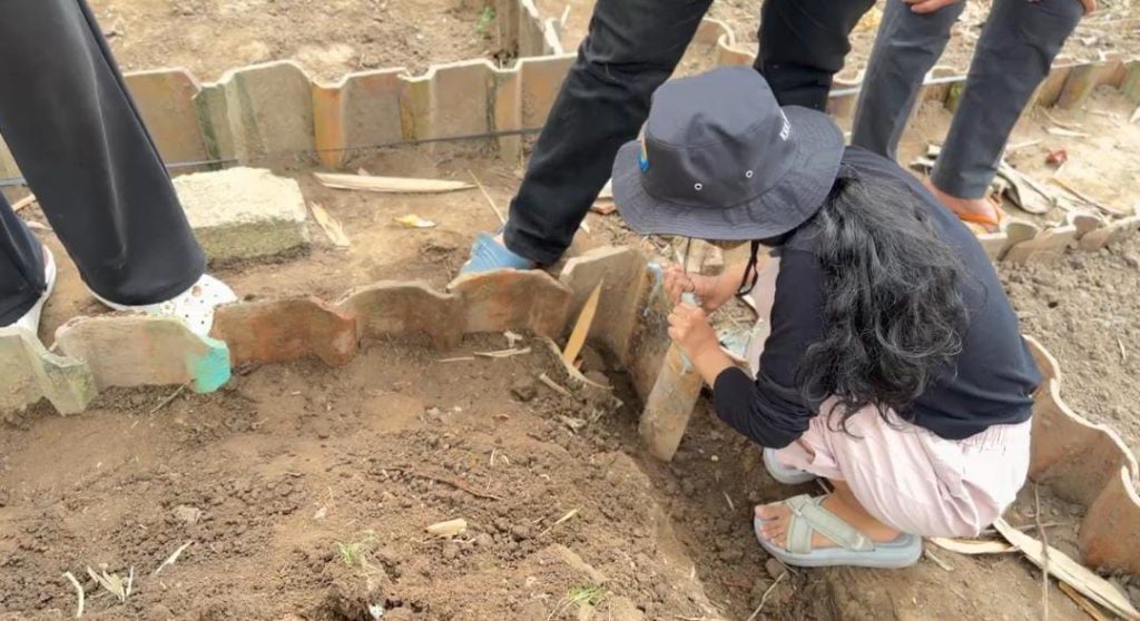Dalam pelaksanaannya, mahasiswa KKN memanfaatkan genteng tanah liat sebagai bahan utama pembuatan raised bed. Genteng tersebut disusun secara melingkar dan memanjang mengikuti bentuk bedengan yang telah direncanakan. Penggunaan genteng tanah liat dinilai efektif karena memiliki daya tahan yang baik serta mampu menjaga kestabilan tanah agar tidak mudah runtuh akibat pengaruh air maupun aktivitas perawatan tanaman.