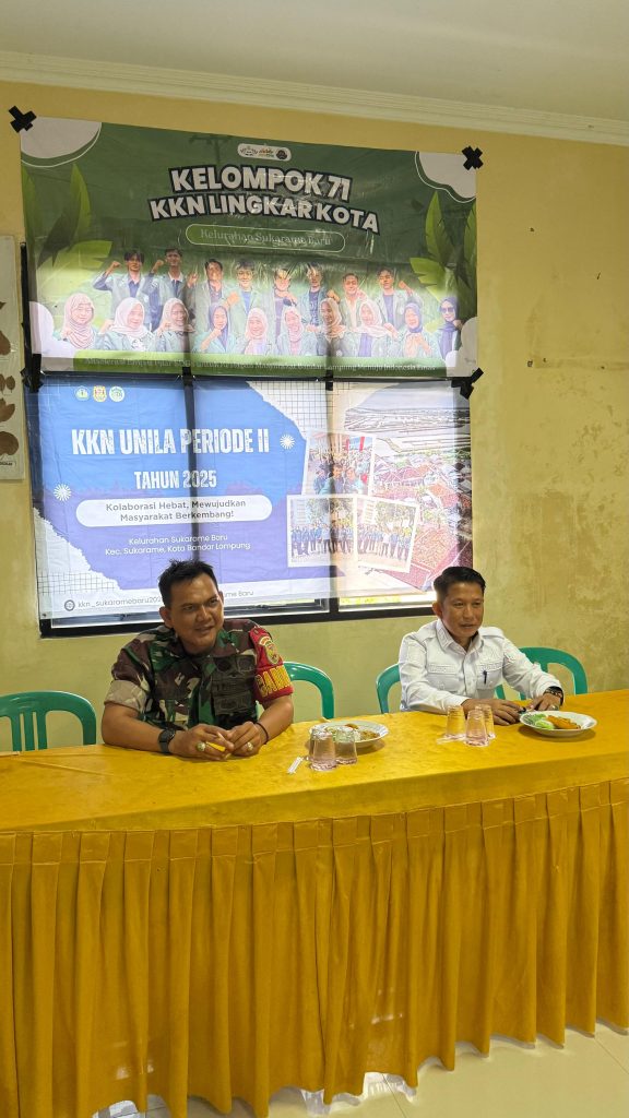 Bandar Lampung, 23 Juli 2025 — Mahasiswa Universitas Lampung (Unila) yang tengah menjalani Kuliah Kerja Nyata (KKN) di Kelurahan Sukarame Baru melaksanakan kegiatan Lokakarya Penyampaian Program Kerja bersama jajaran pemerintah kelurahan, tokoh masyarakat, serta perwakilan RT/RW setempat. Kegiatan ini bertujuan untuk memaparkan secara langsung rencana kerja mahasiswa selama masa pengabdian di tengah masyarakat.