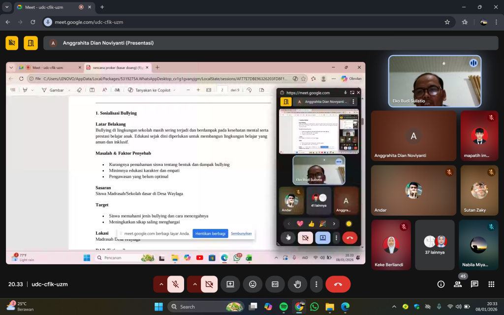 Pada tanggal 8 Januari 2026, Kelompok KKN Waylaga 2 telah melaksanakan kegiatan lokakarya pemaparan program kerja bersama Dosen Pembimbing Lapangan (DPL), Bapak Eko Budi Sulistio, S.Sos., M.A.P. Kegiatan ini dilaksanakan secara daring melalui platform Google Meeting sebagai bagian dari tahapan persiapan pelaksanaan Kuliah Kerja Nyata (KKN) di Kelurahan Waylaga.