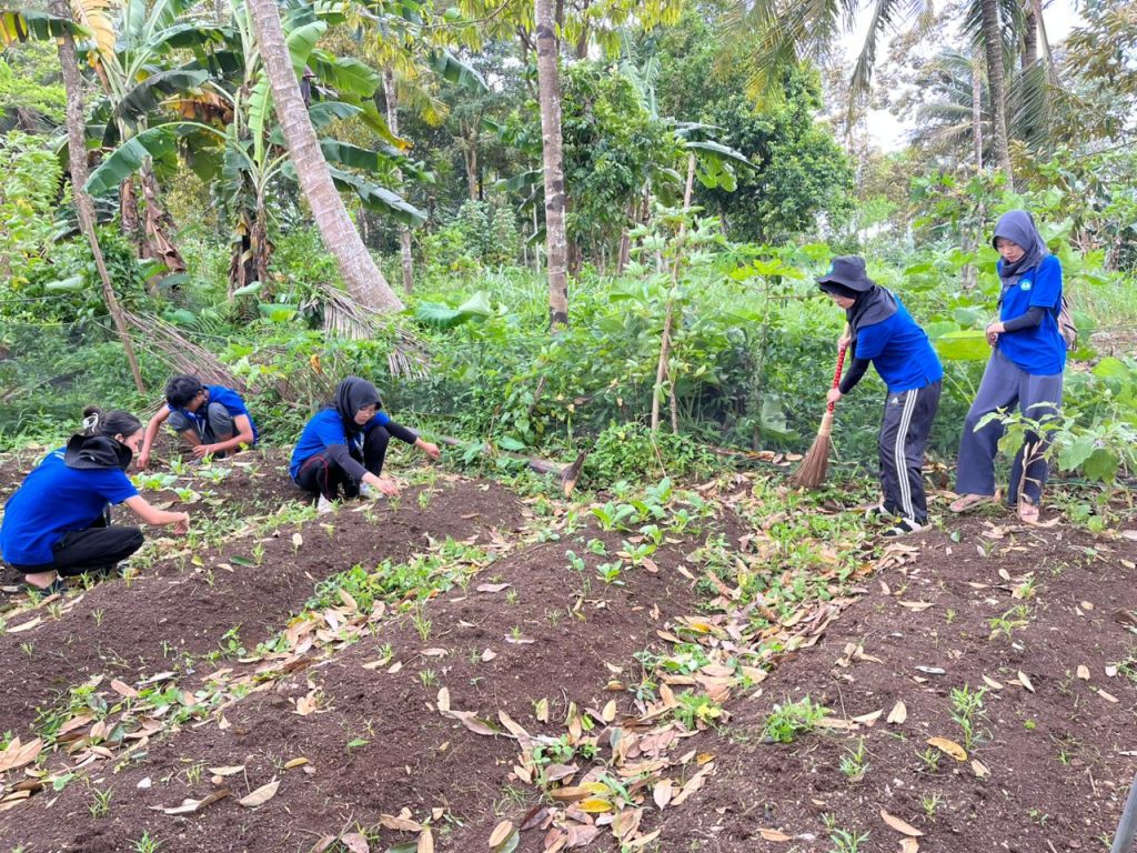 Dalam kegiatan tersebut, mahasiswa KKN dan ibu-ibu PKK bekerja sama membersihkan lahan dari rumput liar, sampah, serta merapikan area tanaman obat agar lebih tertata. Kegiatan berlangsung dengan penuh semangat gotong royong dan kebersamaan, mencerminkan partisipasi aktif masyarakat dalam mendukung program kerja mahasiswa KKN di bidang lingkungan dan kesehatan.