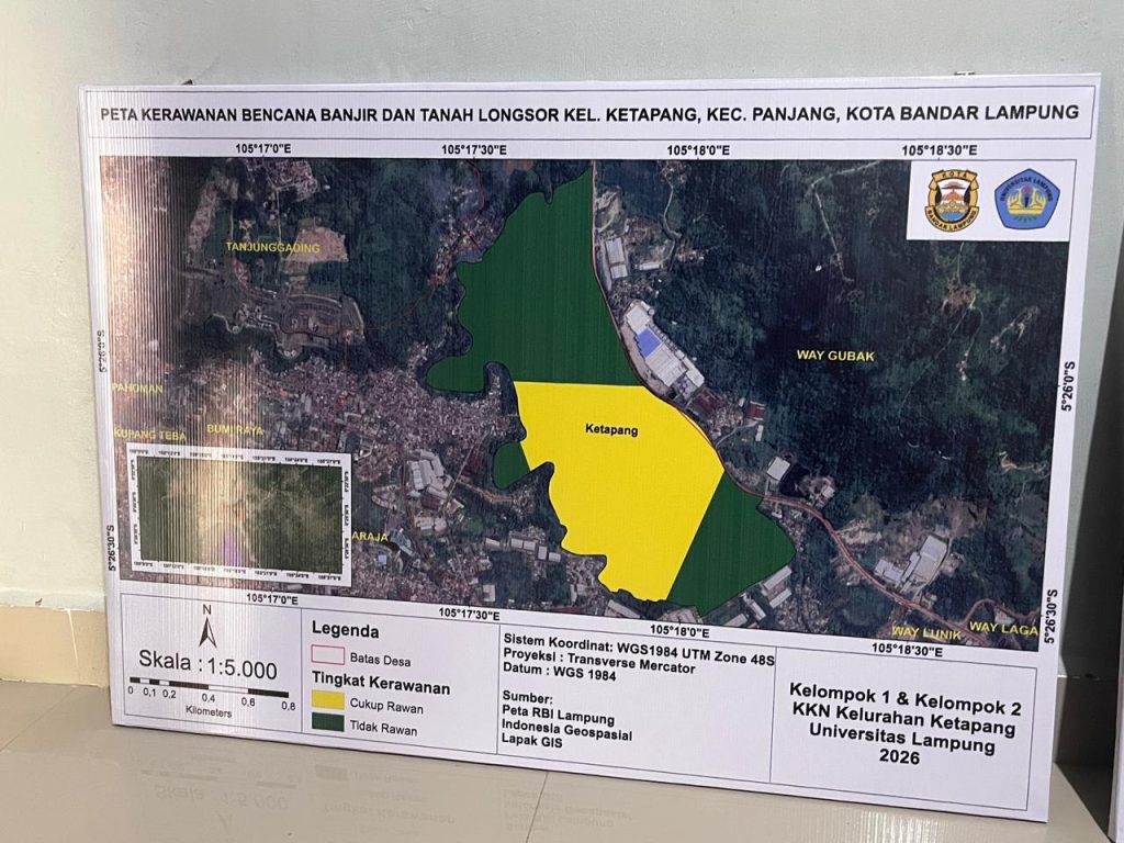 Bandar Lampung, 28 Januari 2026 – Mahasiswa Kuliah Kerja Nyata (KKN) Universitas Lampung (Unila) Periode I Tahun 2026 Desa Ketapang 2 melaksanakan koordinasi bersama Kelompok KKN Desa Ketapang 1 terkait pembuatan dan rencana penyerahan Program Kerja SIGAP (Sistem Informasi Geografis Antisipasi Bencana). Kegiatan ini bertujuan menyusun peta kerawanan bencana sebagai upaya meningkatkan kesiapsiagaan masyarakat Kelurahan Ketapang.