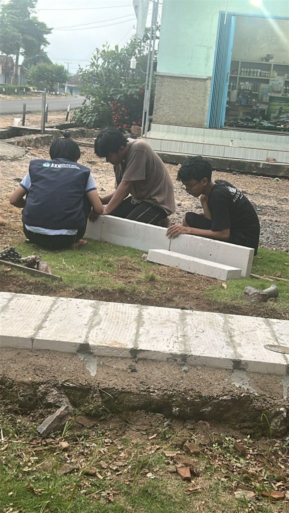 Setelah lokasi siap, mahasiswa KKN melanjutkan kegiatan dengan pembuatan pondasi, yang meliputi proses penggalian tanah, pencampuran material bangunan, hingga perataan pondasi. Seluruh proses dilakukan secara gotong royong dengan pembagian tugas yang jelas, sehingga pekerjaan dapat berjalan dengan tertib dan efisien.