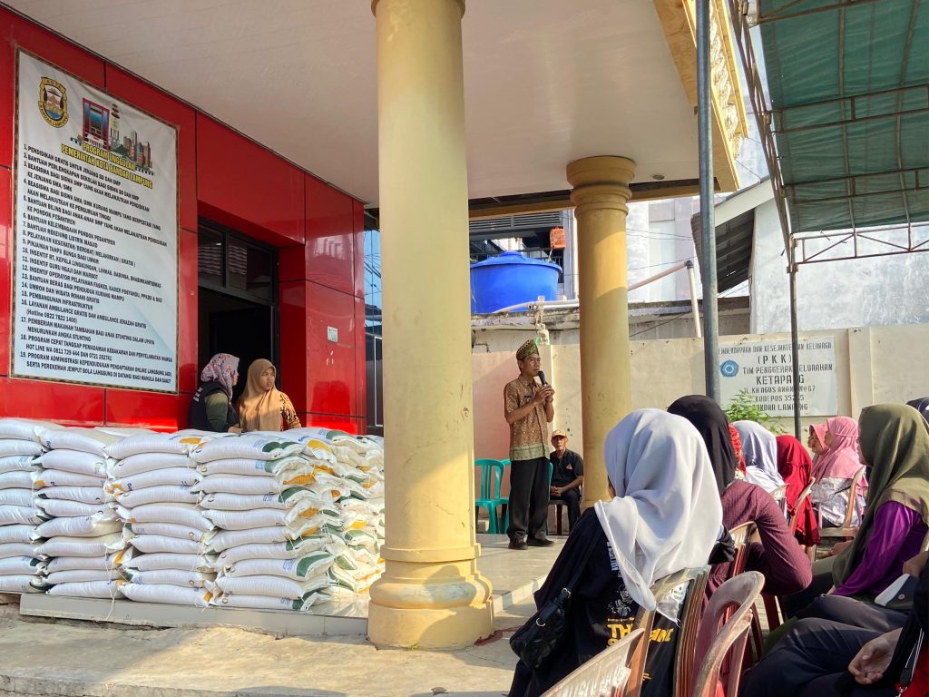 Acara dibuka secara resmi oleh Lurah Ketapang, Bapak Sujito, S.P., yang menyampaikan harapannya agar bantuan ini dapat dimanfaatkan sebaik mungkin oleh masyarakat. Selanjutnya, proses pembagian beras dilakukan kepada warga yang telah menerima kupon, dengan bantuan dari perangkat kelurahan, linmas, serta mahasiswa KKN dari kedua universitas yang bekerja sama secara sigap untuk memastikan distribusi berjalan tertib dan lancar.