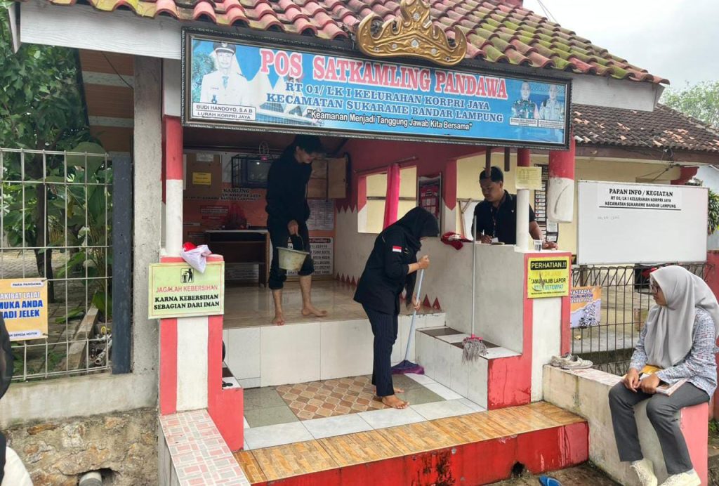 Mahasiswa Kuliah Kerja Nyata (KKN) dari Kelurahan Korpri Jaya kembali menunjukkan kepeduliannya terhadap lingkungan dengan melakukan kegiatan gotong royong membersihkan dan merapikan poskamling. Kegiatan ini dilakukan sebagai bentuk kontribusi dalam menciptakan lingkungan yang aman, nyaman, dan tertib. para mahasiswa bersama warga sekitar mulai membersihkan area sekitar poskamling yang sebelumnya terlihat kurang terawat. Mereka menyapu halaman, membersihkan dinding, serta membuang sampah yang berserakan di sekitar lokasi. Selain membersihkan, mahasiswa juga membantu menata ulang bagian dalam poskamling agar lebih fungsional. Kegiatan ini juga menjadi sarana mempererat hubungan antara mahasiswa dan masyarakat. Kekompakan dan semangat gotong royong tampak jelas selama berlangsungnya kegiatan.