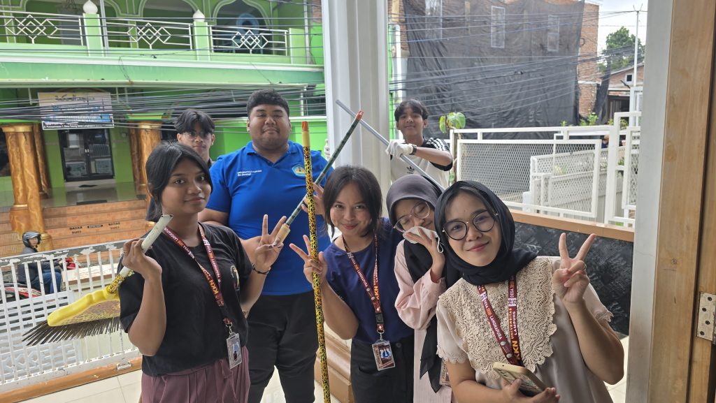 Selain membersihkan lingkungan, mahasiswa juga melakukan pengecekan ringan terhadap fasilitas belajar seperti meja, papan tulis, dan rak Al-Qur’an. Kegiatan selesai pada pukul 11.00 WIB dan ditutup dengan doa bersama.
