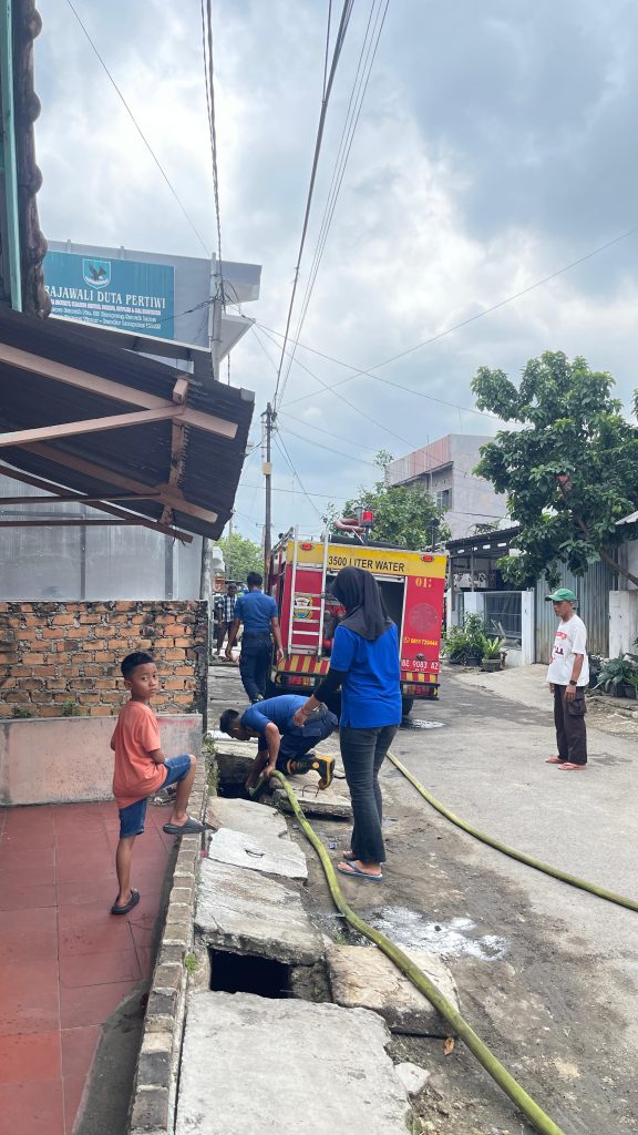 Bandar Lampung, 28 Januari 2026 – Mahasiswa Kuliah Kerja Nyata (KKN) Kelompok Sawah Lama 2 turut berperan aktif dalam kegiatan pembersihan selokan bersama petugas Pemadam Kebakaran (Damkar) dan warga di wilayah Sawah Lama. Pembersihan dilakukan dengan metode penyemprotan menggunakan air bertekanan tinggi untuk mengangkat lumpur, sampah, serta material yang menghambat aliran air.