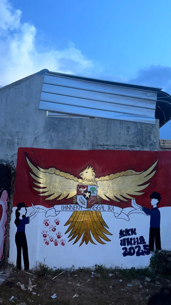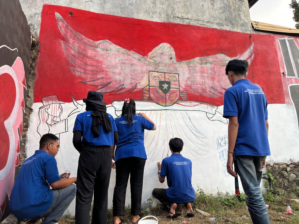 Bandar Lampung, 15 Agustus 2025 — Dalam rangka memeriahkan peringatan Hari Ulang Tahun (HUT) ke-80 Republik Indonesia, mahasiswa Kuliah Kerja Nyata (KKN) Universitas Lampung Periode II Tahun 2025 yang bertugas di Kelurahan Sumber Rejo, Kecamatan Kemiling, melaksanakan kegiatan pembuatan mural bertema kemerdekaan.
