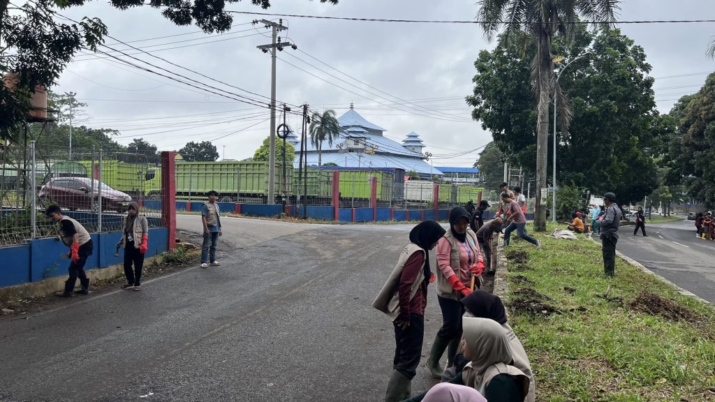 Bandar Lampung — Mahasiswa Kuliah Kerja Nyata (KKN) Universitas Lampung Kelompok 1 Kelurahan Rajabasa melaksanakan kegiatan Jumat Bersih rutin pada Jumat pagi, 30 Januari 2026, mulai pukul 07.30 WIB. Kegiatan ini berlangsung di area depan Kantor Kecamatan Rajabasa, Kota Bandar Lampung.