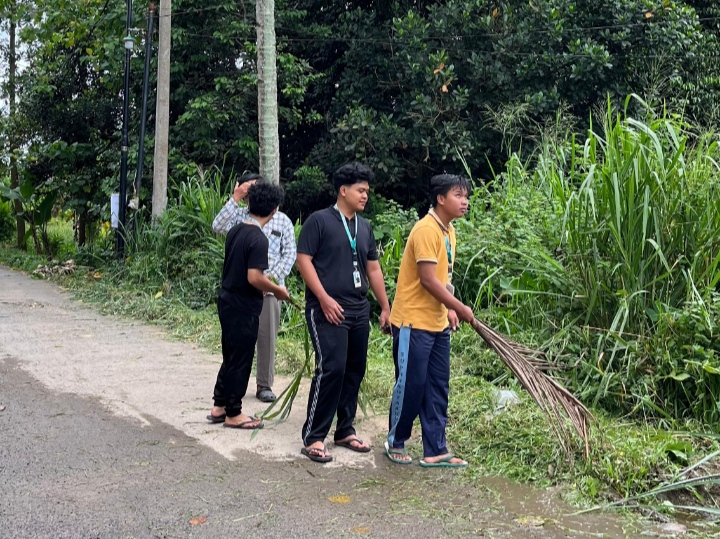 Mahasiswa bersama RT, Ketua Lingkungan, Lurah, Linmas, dan Babinsa Membersihkan pinggiran jalan yang berumput di gang Rewok RT 05 LK 2 Kelurahan Campang Jaya.