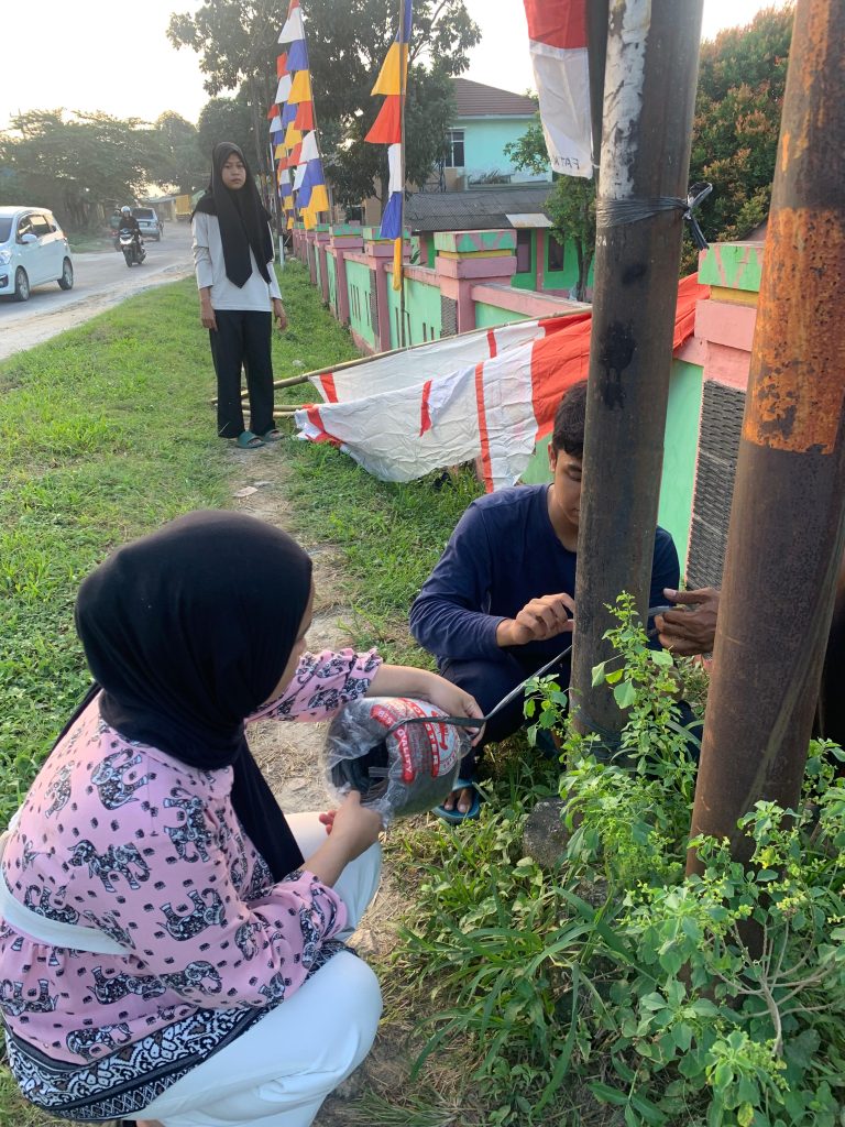 Dimulai dari sore hari, mahasiswa bersama ketua RT 9 bergotong royong menyiapkan tiang, merapikan area pemasangan, dan memasang bendera di sepanjang jalan lingkungan. Kegiatan ini dilakukan untuk menumbuhkan semangat nasionalisme sekaligus memperindah suasana desa menjelang 17 Agustus.