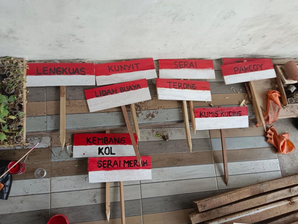 Proses pembuatan diawali dengan menyiapkan bahan papan kayu, cat, dan alat tulis. Para mahasiswa kemudian menulis informasi tanaman dengan rapi dan jelas, sehingga mudah dibaca oleh warga. Papan nama ini tidak hanya berfungsi sebagai penanda, tetapi juga sebagai media edukasi bagi masyarakat mengenai jenis tanaman yang ditanam, baik tanaman sayuran maupun tanaman obat keluarga.