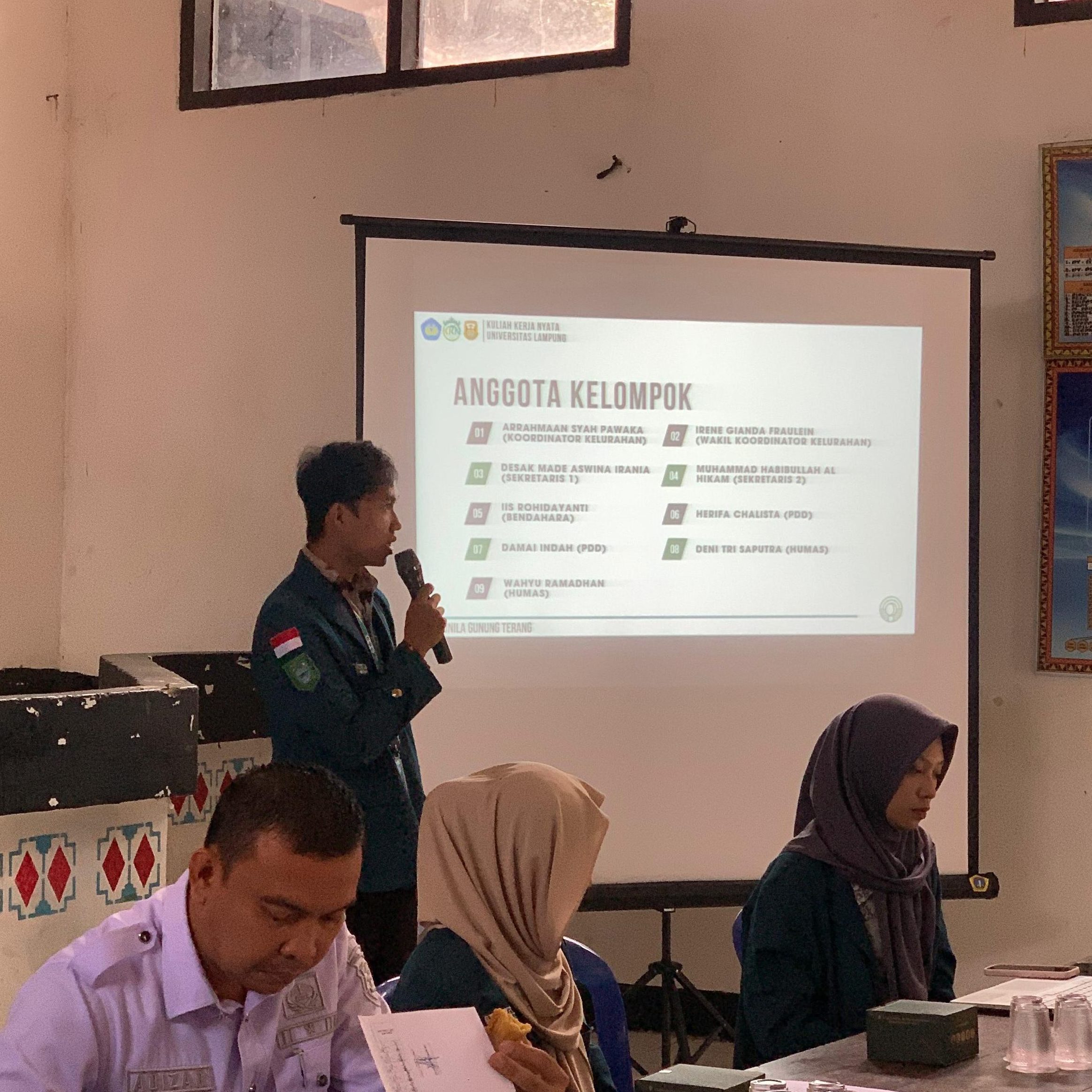 Bandar Lampung, 23 Juli 2025 – Mahasiswa KKN Universitas Lampung Periode II Tahun 2025 melaksanakan lokakarya program kerja di Kelurahan Gunung Terang. Acara ini dihadiri oleh Lurah Gunung Terang, Ketua RT, Ketua Lingkungan (Kaling). Kehadiran pihak kelurahan dan masyarakat menjadi wujud dukungan serta sinergi dalam menyukseskan rangkaian program kerja mahasiswa selama masa pengabdian.