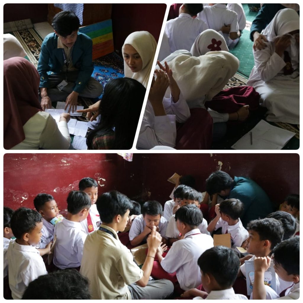 Suasana hangat dan akrab tampak dalam foto-foto yang diabadikan. Para mahasiswa terlihat duduk melingkar bersama anak-anak, mendengarkan cerita mereka dengan antusias. Di satu sisi, ada kelompok yang berbagi cerita di ruang kelas, sementara di sisi lain, tampak sekelompok siswa lainnya yang duduk lesehan dengan penuh perhatian mendengarkan salah satu mahasiswa bercerita.