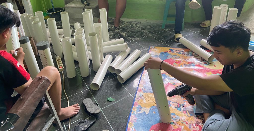 Kegiatan ini dilaksanakan di posko, di mana seluruh anggota tim turut serta dalam proses persiapan. Terlihat para mahasiswa tengah mempersiapkan pipa paralon yang nantinya akan digunakan sebagai media utama lubang biopori. Pipa-pipa tersebut dilubangi menggunakan bor dan ditandai dengan spidol sesuai pola agar dapat berfungsi optimal dalam menyerap air dan sampah organik.