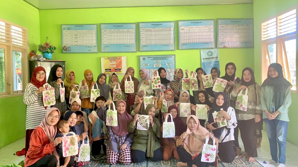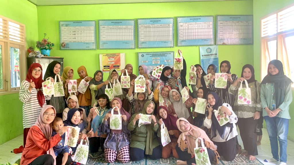Ecoprint merupakan teknik mencetak motif pada kain menggunakan bahan-bahan alami seperti daun, bunga, batang, dan akar tanaman. Proses ini dilakukan tanpa menggunakan bahan kimia berbahaya, sehingga ramah lingkungan dan memiliki nilai estetika serta ekonomi tinggi.Dalam pelatihan ini, para mahasiswa mengajak warga—terutama ibu-ibu PKK dan remaja putri—untuk mengenal dan mempraktikkan proses ecoprint mulai dari pemilihan bahan, penataan motif di atas kain, pengukusan, hingga pengeringan hasil akhir. Bahan-bahan seperti daun jati, daun jarak, dan bunga kertas menjadi pilihan utama karena mudah ditemukan di lingkungan sekitar.