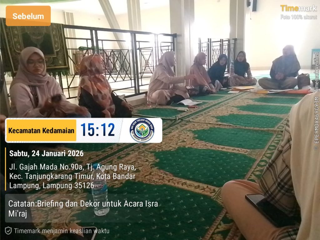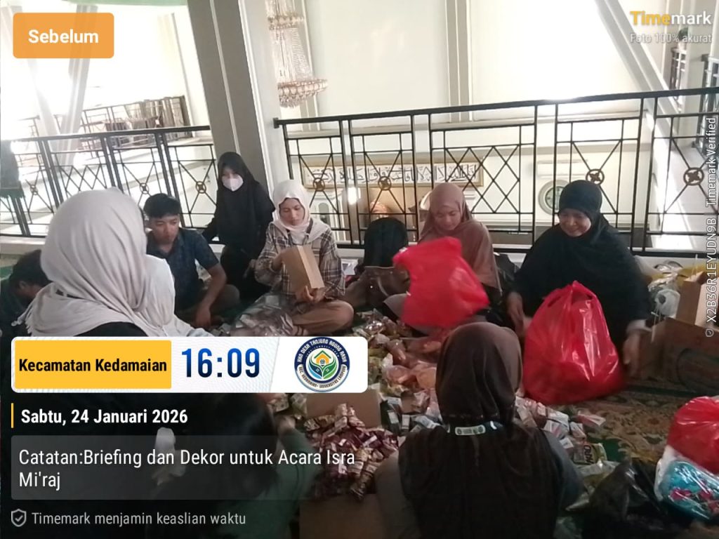 BANDAR LAMPUNG – Mahasiswa Kuliah Kerja Nyata (KKN) Universitas Lampung (Unila) Kelurahan Tanjung Agung Raya bersama warga setempat melaksanakan kegiatan dekorasi di Masjid Al-Karomah pada Sabtu (24/01/2026). Kegiatan ini dilakukan sebagai persiapan menyambut peringatan Isra Mi’raj yang akan diselenggarakan pada Minggu, 25 Januari 2026.