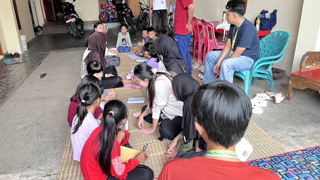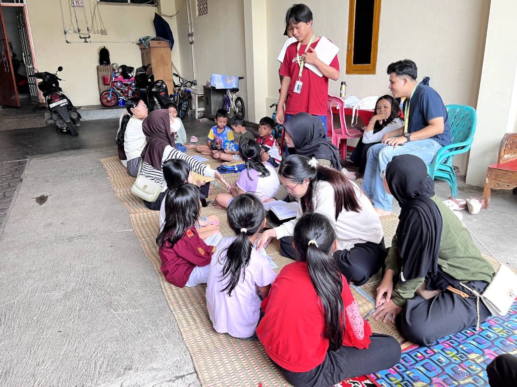 Pada pertemuan ke-3 ini, mahasiswa KKN tidak hanya memberikan bimbingan materi formal, tetapi juga menyisipkan metode fun learning. Mahasiswa membagi anak-anak ke dalam beberapa kelompok kecil berdasarkan jenjang pendidikan untuk memastikan pendampingan yang lebih efektif dan personal.