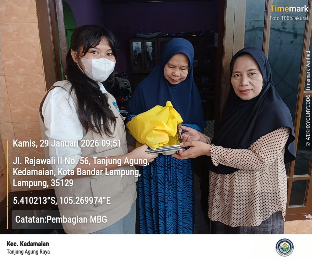 BANDAR LAMPUNG – Mahasiswa Kuliah Kerja Nyata (KKN) Universitas Lampung turut membantu Kader Makan Bergizi Gratis (MBG) dalam mendistribusikan sebanyak 96 paket bantuan pangan kepada warga di Kelurahan Tanjung Agung Raya pada Kamis (29/01/2026). Bantuan tersebut disalurkan kepada kelompok prioritas yang terdiri atas 7 ibu hamil, 19 ibu menyusui, dan 70 balita.