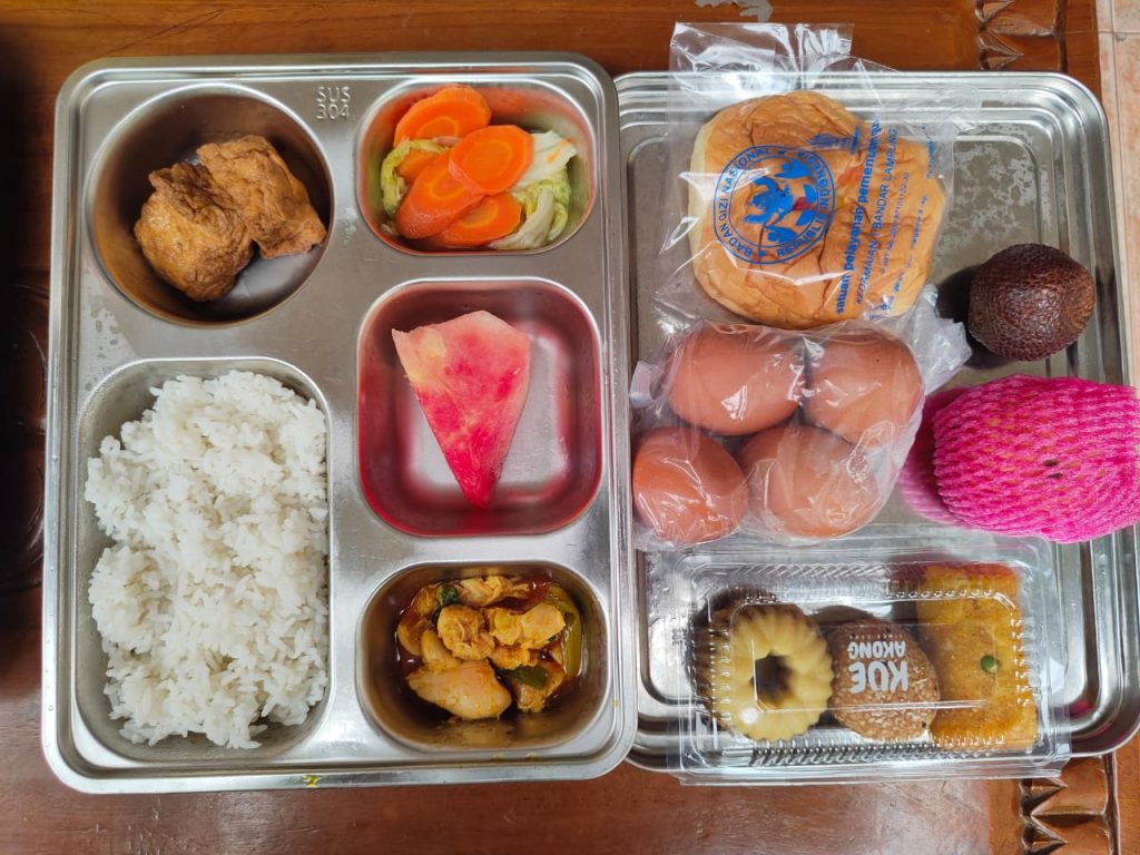 Menu makanan yang dibagikan telah disesuaikan dengan standar gizi seimbang, terdiri dari nasi, tumis ayam suwir, tahu, serta tumis sayuran berupa wortel dan sawi. Selain itu, setiap paket juga dilengkapi dengan telur, roti, risol, kue basah, serta buah-buahan seperti apel, semangka, dan salak. Khusus bagi ibu hamil dan ibu menyusui, porsi makanan yang diberikan lebih banyak dibandingkan dengan porsi balita untuk memenuhi kebutuhan gizi harian yang lebih tinggi. Keterlibatan mahasiswa KKN Universitas Lampung dalam kegiatan ini bertujuan untuk membantu kelancaran proses distribusi makanan bergizi gratis.
