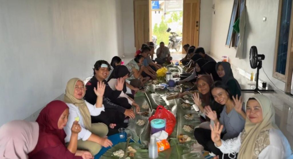 Mahasiswa KKN bersama para tamu undangan menikmati hidangan yang telah disiapkan secara bersama-sama. Kegiatan berlangsung dengan tertib dan penuh rasa saling menghormati. Kebersamaan yang tercipta mencerminkan hubungan yang harmonis antara mahasiswa dan masyarakat desa. Momen ini menjadi bagian penting dari rangkaian kegiatan KKN.