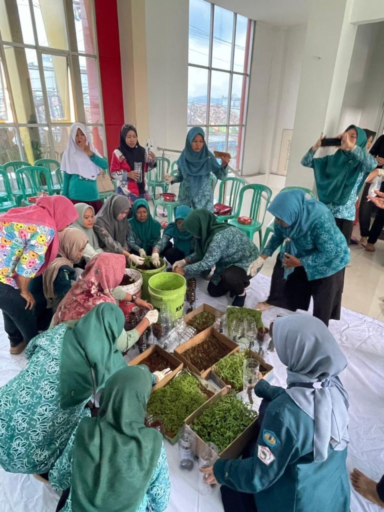 Usai penjelasan, peserta diajak mengikuti praktik langsung pembuatan instalasi hidroponik sederhana. Mahasiswa memandu proses pembuatan mulai dari persiapan botol bekas sebagai wadah, pemasangan sumbu (wick) sebagai penyalur nutrisi, pengisian cocopeat, hingga penanaman benih sayuran seperti sawi, selada, dan kangkung. Peserta juga diberikan panduan pembuatan larutan nutrisi AB Mix serta tips perawatan tanaman agar hasil panen optimal.