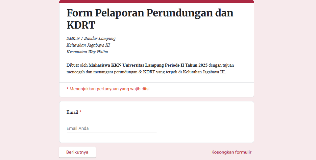 Mahasiswa Kuliah Kerja Nyata (KKN) Universitas Lampung di Kelurahan Jagabaya III mengembangkan Google Form (GForm) sebagai wadah pelaporan kasus perundungan (bullying) dan kekerasan dalam rumah tangga (KDRT) di kalangan siswa. Program ini merupakan salah satu upaya pencegahan dan penanganan dini terhadap kekerasan pada anak, khususnya di lingkungan sekolah. Melalui GForm ini, siswa dapat melaporkan kejadian yang dialami atau disaksikan secara aman dan rahasia.