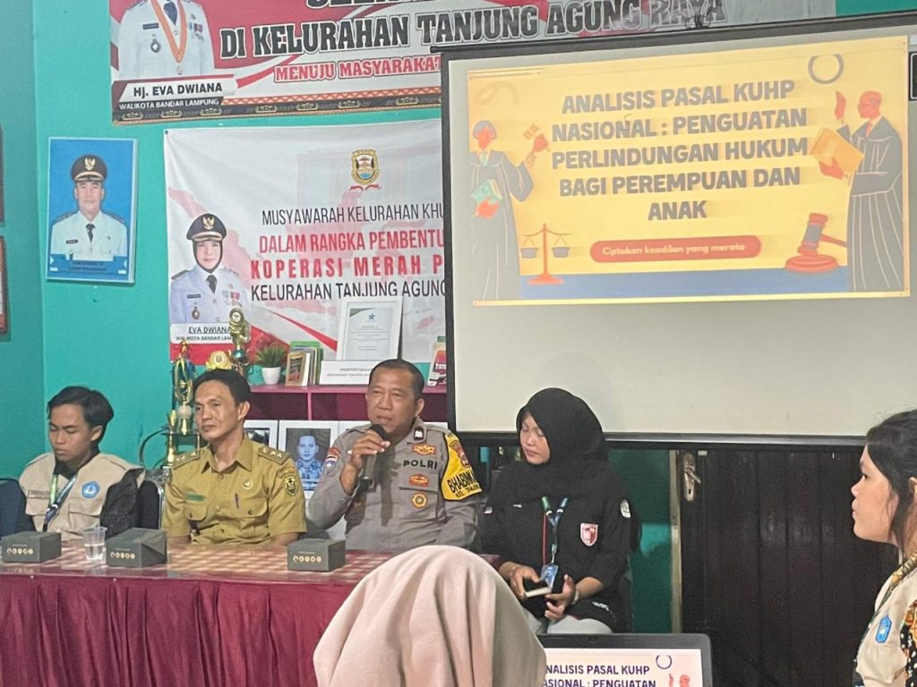 Acara dimulai pukul 13.00 WIB dengan sambutan dari Lurah Tanjung Agung Raya, Bapak Angga Wijaya, S.T., yang kemudian dilanjutkan dengan sambutan Koordinator Kelurahan mahasiswa KKN Unila. Sosialisasi ini bertujuan memberikan pemahaman kepada masyarakat mengenai perbedaan KUHP lama dan KUHP Nasional (UU No. 1 Tahun 2023) serta penguatan perlindungan hukum bagi perempuan dan anak.
