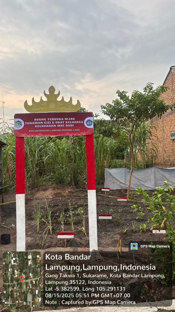 Bandarlampung, 15 Agustus 2025- Mahasiswa KKN Unila di Kelurahan Way Dadi melaksanakan pemasangan Gapura Ruang Terbuka Hijau (RTH) sebagai bagian dari program kerja Hijaukan Bersama Desa dan Taman Gizi Keluarga. Kegiatan ini bertujuan memberikan identitas sekaligus memperindah area RTH yang dirancang sebagai pusat penghijauan dan edukasi lingkungan bagi warga.