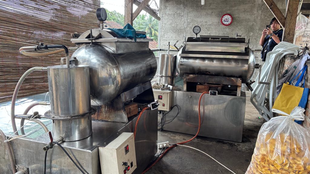 Dalam kegiatan tersebut, mahasiswa KKN memperoleh penjelasan langsung mengenai tahapan proses produksi keripik, mulai dari pemilihan bahan baku, proses pengupasan dan pemotongan, penggorengan menggunakan alat vacuum frying, hingga proses penirisan dan pengemasan produk. Penggunaan metode vacuum frying dinilai lebih unggul dibandingkan penggorengan konvensional karena mampu mengurangi kandungan minyak, mempertahankan nilai gizi, serta meningkatkan daya simpan produk. Hal ini menjadi nilai tambah bagi Keripik Zahwa dalam menghadapi persaingan pasar.